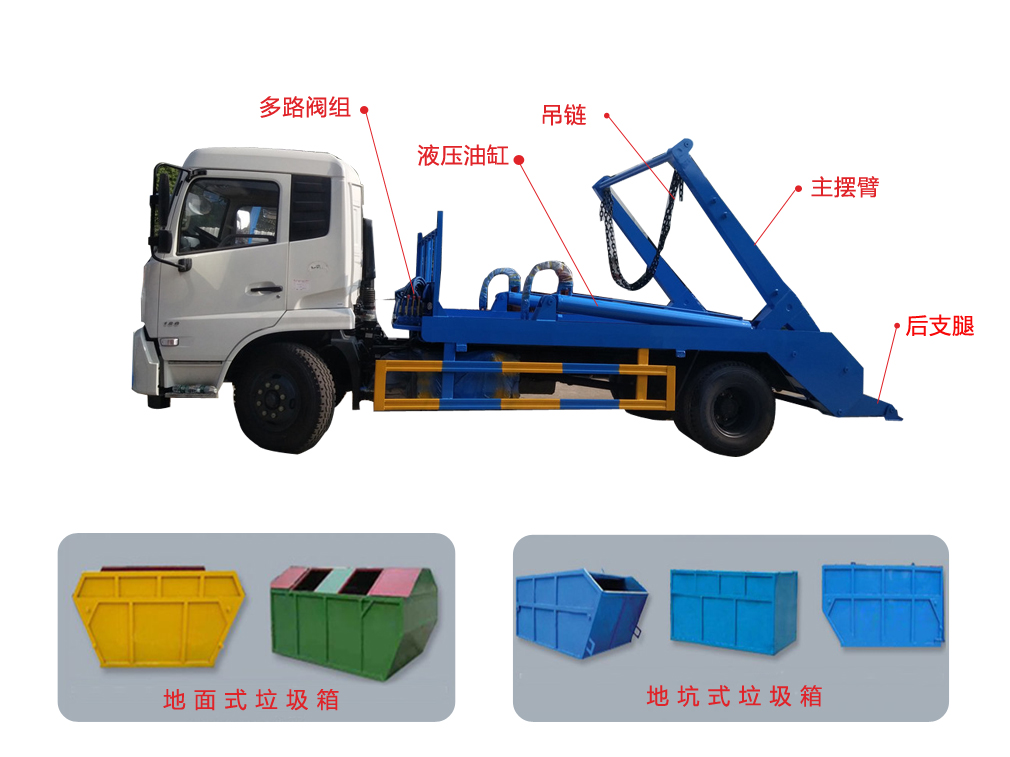 • 擺臂垃圾車:加裝統一配套液壓舉升總成,通過左右兩臂裝運垃圾斗,可一車多斗,帶自卸功能,達到安全穩定,性能可靠。垃圾斗廂體分為按擺臂式和地坑地面兩用式配置不同形式的垃圾斗。可加裝密封蓋,防止泄露飛揚污染,以適應不同環境使用要求,可由生產廠家為用戶提供垃圾斗圖紙,協助用戶設計垃圾。
