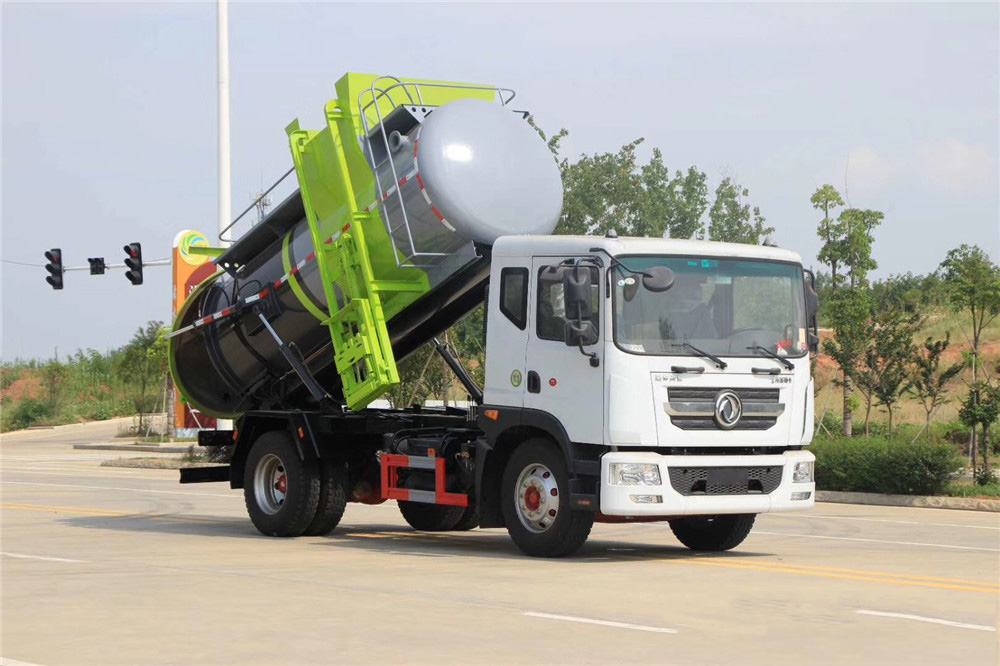 上裝配置:罐體采用4mm優質Q345錳板制作,圓形罐體,罐體前后封頭采用圓弧蝶形封頭,罐體尾端及罐體后封頭外加25~30mm厚法蘭,罐體與后封頭上部采用鉸鏈連接,后封頭可利用液壓油缸打開卸料;罐體右側前部裝有掛桶提升機構裝卸桶裝垃圾,掛桶提升機前側裝有圓形液位計;罐體后部兩側安裝液壓油缸實現罐體舉升自卸。后蓋采用液壓鎖緊,室外手動液壓操作。