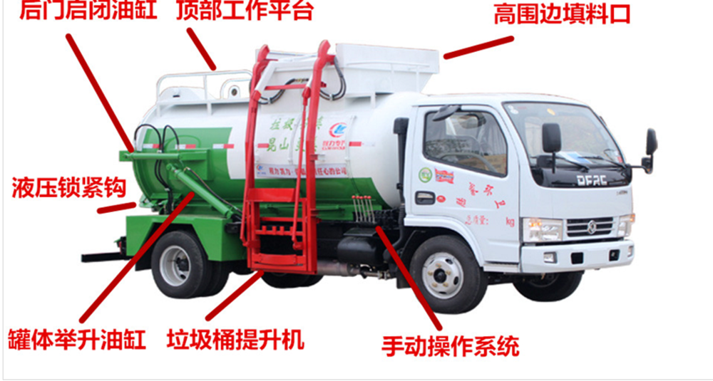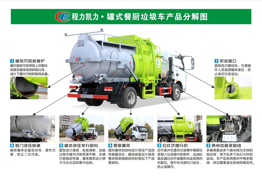 罐體內分上、下兩層,下層為固液分離后污水收集箱,污水箱兩頭高,中間低,最低端設有出水口,以保證污水排放干凈,料口及后門為液壓密封,上料為提升拉桿式,罐體帶舉升自卸功能,讓排泄更徹底干凈。餐廚垃圾車除了單一的運輸、收集外,還可選裝固液分離裝置、吸污功能、罐體清洗功能等。液壓系統由泵、液壓閥和順序閥以及各種功能的液壓油缸、高低壓管路組成。關鍵部件可選用原裝進口,保證產品工作可靠、安全。垃圾投入口與推板之間有足夠距離,推板與罐體內表面設有密封裝置,避免餐廚垃圾投入過程及分離過程中溢到推板后方。