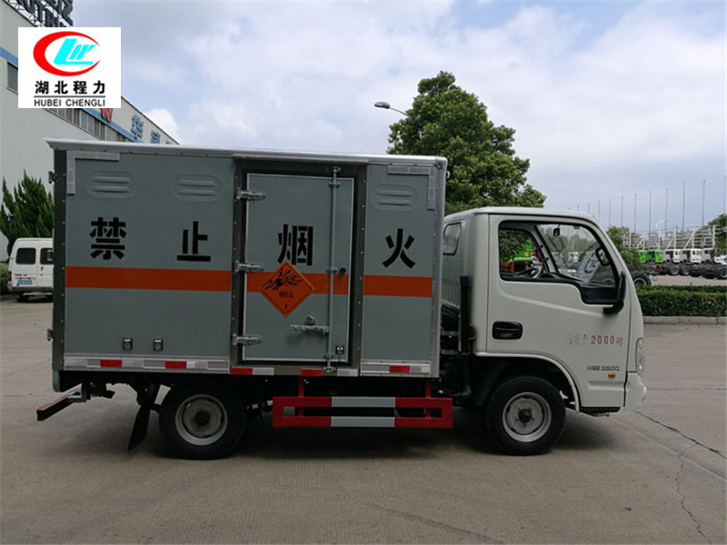 廂體采用外飾1.2mm厚的冷扎鋼板,內飾采用1mm厚的鋁板,中間夾有4cm厚的隔熱阻燃泡沫層制作,廂體底板采用4mm厚的鋼板制作,廂體底部鋪有防靜電膠皮,廂體兩側安裝固定貨物卡槽或臥環,廂體頂部中間位置安裝煙霧報警器,后門及側門安裝防盜報警器,廂體前面鋪靜電膠皮,帶側門,后雙門,廂體顏色根據客戶要求變換,帶兩只滅火器和排氣管防火罩、三角危險品頂燈,其余標配。