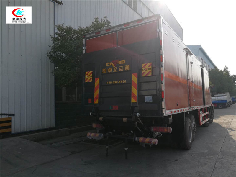 4mm厚的鋼板制作,廂體底部鋪有防靜電膠皮,廂體兩側(cè)安裝固定貨物卡槽或臥環(huán),廂體頂部中間位置安裝煙霧報(bào)警器,后門及側(cè)門安裝防盜報(bào)警器,廂體前面鋪靜電膠皮,帶側(cè)門,后雙門,廂體顏色根據(jù)客戶要求變換,帶兩只滅火器和排氣管防火罩、三角危險(xiǎn)品頂燈,其余標(biāo)配。