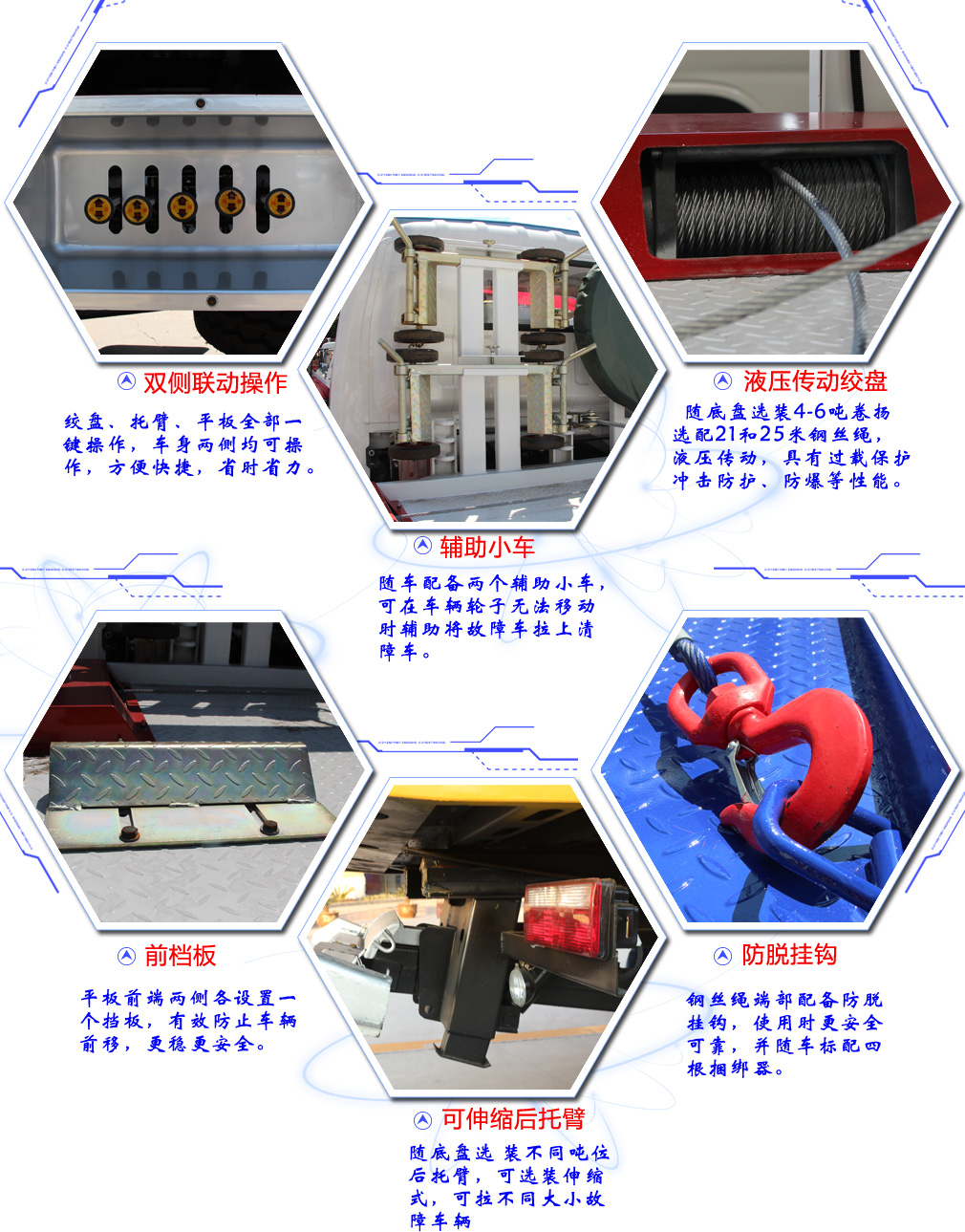 上裝配置:采用武鋼優質碳鋼板制作,一次成型沖壓板,配警示燈一個,喊話器,4噸液壓絞盤一個,25米鋼絲繩,輔助小車一對,L型拖叉一對,工具箱一個,繃帶6根,其它嚴格按照企業標準生產。 公司提供底盤合格證、保修手冊、整車合格證、整車上戶發票、說明書及隨車工具。