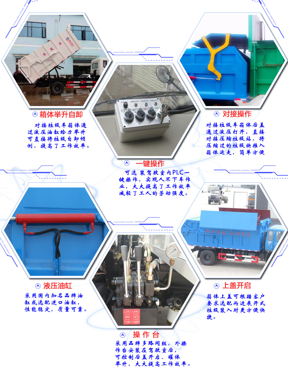 對接式垃圾車又稱壓縮式對接垃圾車:是用于城鎮垃圾壓縮站內的垃圾轉運、卸料作業的專用車,該垃圾車的收運方式是目前國內廣泛采用的垃圾壓縮站垃圾轉運方式,可以實現一車多站,大大降低了配備成本和空間等等。其專用裝置的功能均以汽車發動機為動力,通過液壓機構手動或電控,氣控來實現。車輛的箱體采用優質碳鋼板全密封